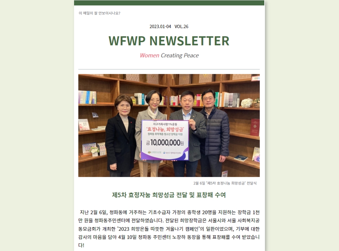 뉴스레터를 신청해 주셔서 감사드립니다. 2023.01-04 VOL.26 WFWP NEWSLETTER WomenCreating Peace |