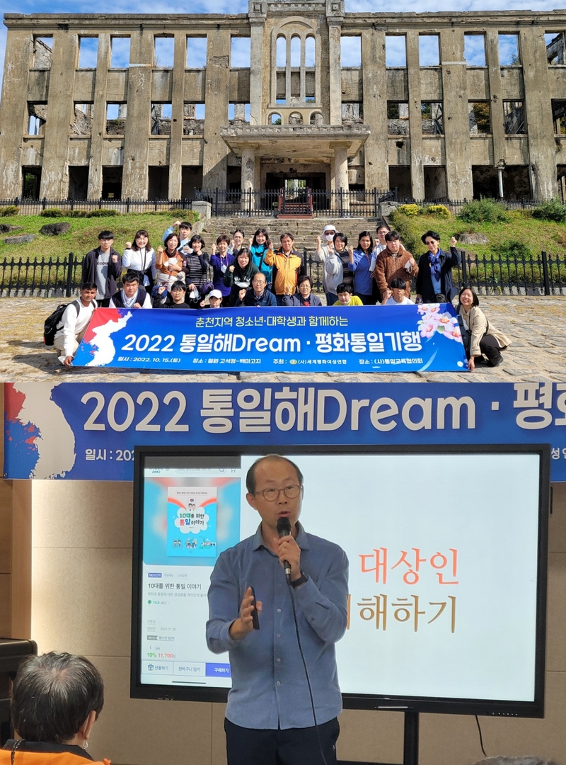 춘천지부는 지역 청소년을 대상으로 '2022 통일해Dream - 평화통일기행'을 개최했습니다. 통일특강을 듣고 전쟁의 상흔이 남은 현장을 직접 돌아보며 학생들은 "남북통일에 대한 거부감이 없어졌다." "통일이 빨리 이루어지면 좋겠다"라는 소감을 전했습니다. 10월 15일 참가자들과 라훈일 통일교육위원의 강의 |