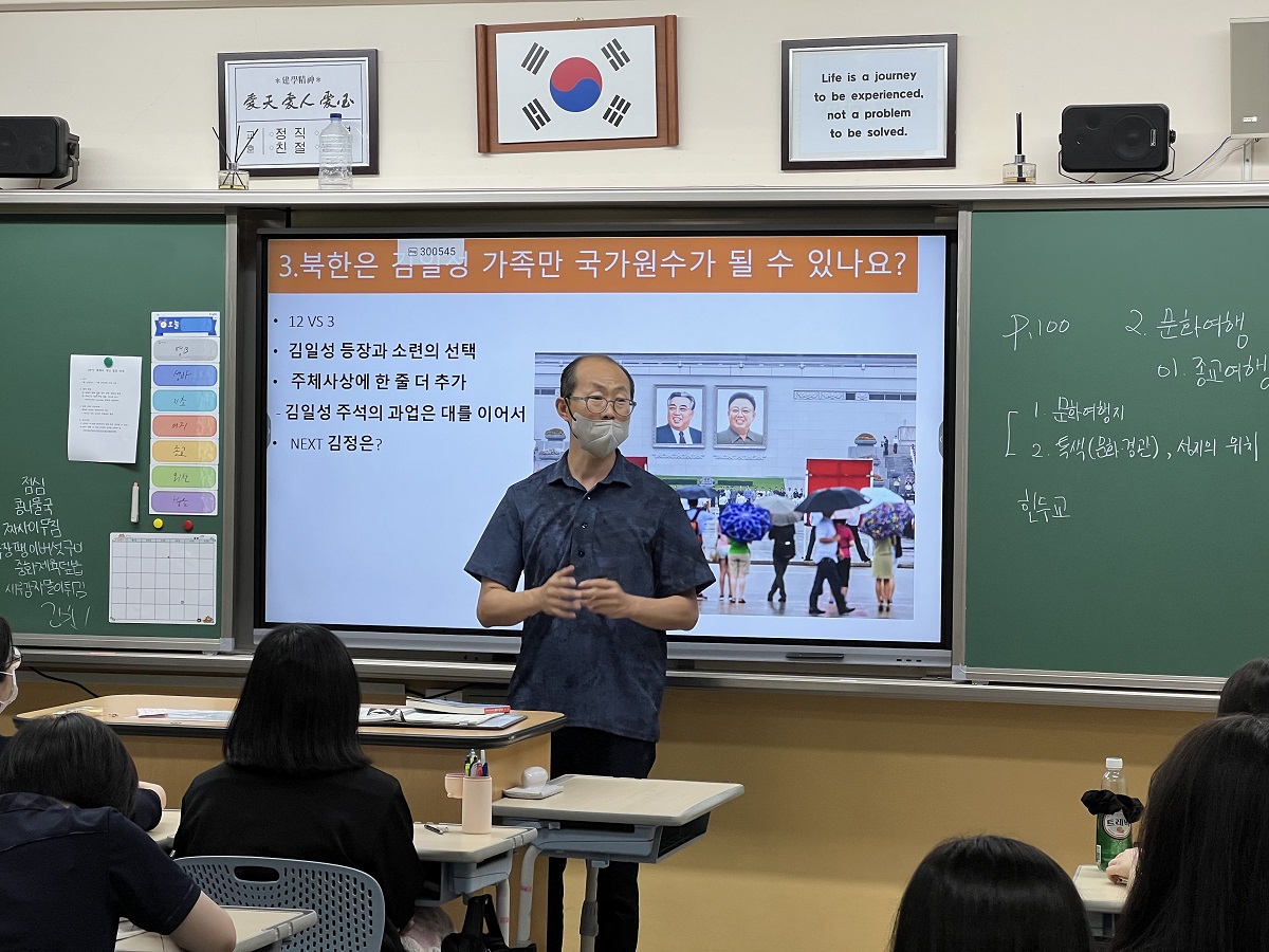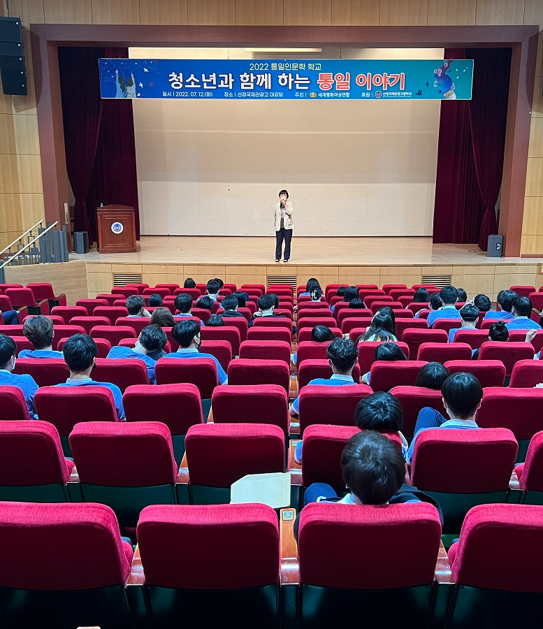지난 7월 11일부터 15일까지 선정국제관광고와 선정고등학교 학생 460여명을 대상으로 ‘통일인문학 학교’를 개최했습니다. 최근 MZ 세대 사이에서 증가하는 통일에 대한 무관심과 회의를 없애고, 10대들이 공감할 수 있는 도서나 영상 등의 콘텐츠를 활용하면서 현실적이고 공감 가능한 통일교육을 실시했습니다. 7월 12일 선정국제관광고 대강당에 모인 학생들 |