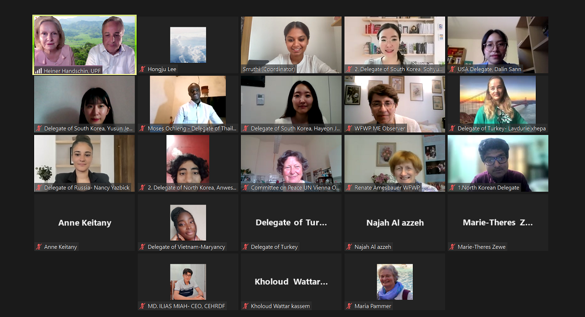 세계평화여성연합 유엔 제네바 사무국은 지난 8월 19일-20일 오후 2-8시에 ‘한반도 평화협정’을 주제로 ‘WFWPI Youth Peace Conference 2022’를 온라인으로 개최했습니다. 컨퍼런스는 전세계에서 참가한 30여명의 청년들이 각자가 맡은 국가를 대표하여 한반도의 평화를 위해 입장 성명과 평화 협정 방안을 모색하고, 온라인으로 함께 평화협정문을 제작했습니다. |