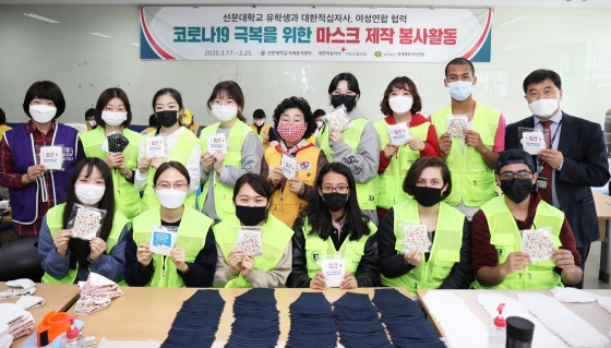 선문대학교는 최근 교내 유학생들이 대한적십자사 아산지구협의회, 세계평화여성연합 회원과 함께 필터 교체형 천 마스크 4000장을 제작했다고 20일 밝혔다.