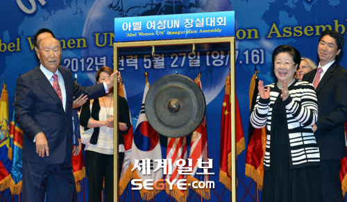 윗 사진은 문 총재가 아벨여성유엔 창설대회에서 기조연설을 하는 모습. 아래 사진은 문 총재 내외가 아벨여성유엔 창설을 선포하는 타종을 한 뒤