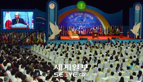 ‘아벨여성유엔 창설대회’가 16일 경기 가평군 청심평화월드센터에서 열렸다. 이날 아벨여성유엔 창설대회는 문선명 통일교 총재·한학자 세계평화여성연합 총재 내외와 문국진 통일그룹 회장을 비롯해 세계 130개국에서 온 여성 지도자, 평화