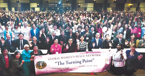 | 미국 라스베이거스 엠(M)호텔에서 열린 세계여성평화네트워크(GWPN)대회 직후 한학자 총재, 문난영 회장을 중심으로 참가자들이 기념사진을 찍고 있다. 세계평화여성연합 제공 |