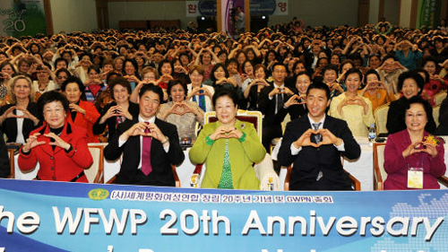 26일 충남 보령시 무창포 비체팰리스에서 열린 세계평화여성연합 창립 20주년 기념 ‘세계여성평화네트워크 총회’에서 참석자들이 손으로 하트 모양을 해 보이고 있다. 앞줄 왼쪽부터 뤼슈롄 전 대만 부총통, 문국진 통일그룹 회장, 한학자 총재, 문형진 통일교 단체로 현실적인 평화운동을 전개하고 있다”며 지난 20년간 여성 권익 신장, 보건·교육에 대한 여성의 접근성 향상, 화해와 평화 조성을 위해 수많은 프로젝트를 진행해온 데 대해 감사를 표했다.
