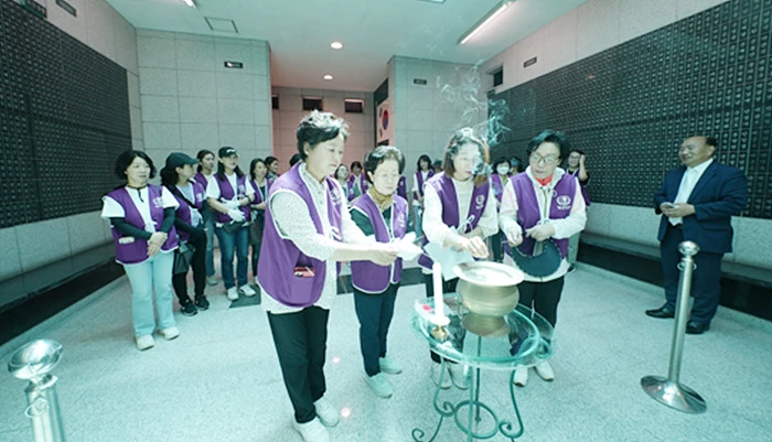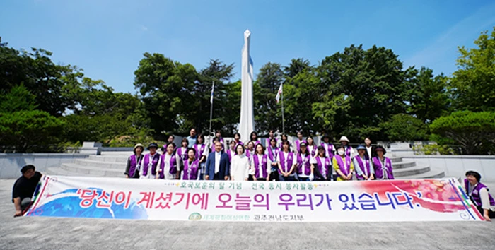 세계평화여성연합 광주전남도지회(회장 엔도하루미)는 지난 23일 6월 호국보훈의 달을 기념하여 ‘당신이 계셨기에 오늘 우리가 있습니다.’ 라는 주제로 광주공원 현충탑과 위패봉안소에서 여성연합 회원 40여명이 참배와 추모식 및 청소 봉사활동을 진행하며 희생정신을 기렸다.